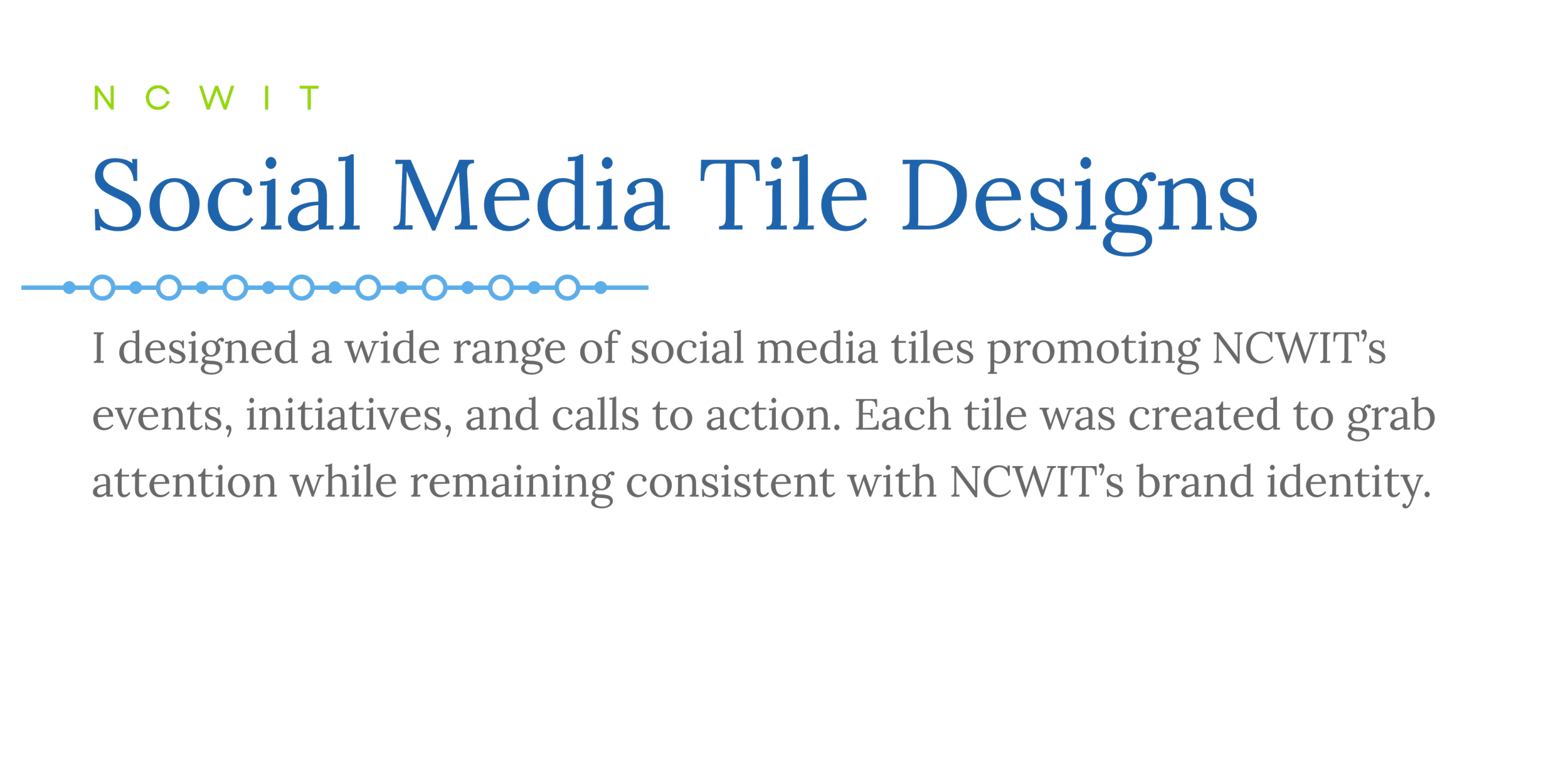 While working as a Junior Graphic Designer for the National Center for Women & Information Technology (NCWIT), I was responsible for creating a variety of design assets to support their mission of increasing women’s participation in technology and computing. My primary role focused on designing social media tiles, presentation templates, flyer templates, certificates of achievement, and email headers. I was also tasked with creating customizable templates for their call-to-action advertisements, awards, and event promotions. My designs were crafted to align with NCWIT’s existing brand guidelines while ensuring the visuals were engaging, clear, and impactful for their audience.